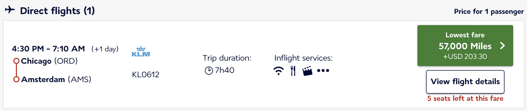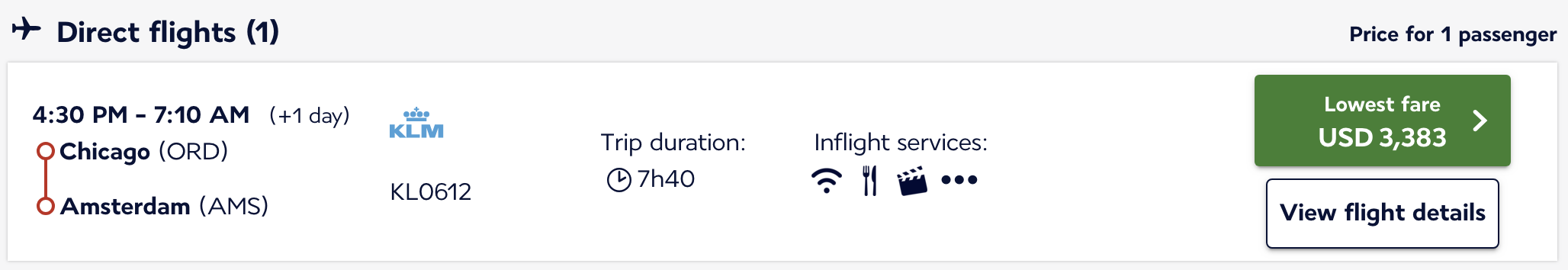 For example, transferring 57,000 Ultimate Rewards points to Air France-KLM Flying Blue could earn you a one-way business class ticket from Chicago (ORD) to Amsterdam (AMS). The normal cost of this flight is $3,383.